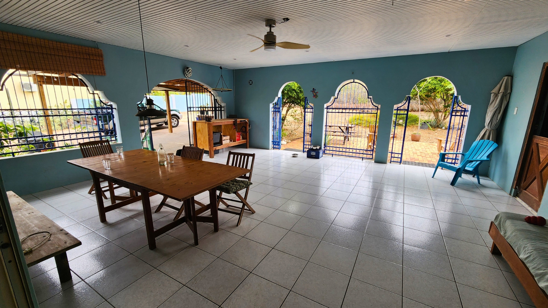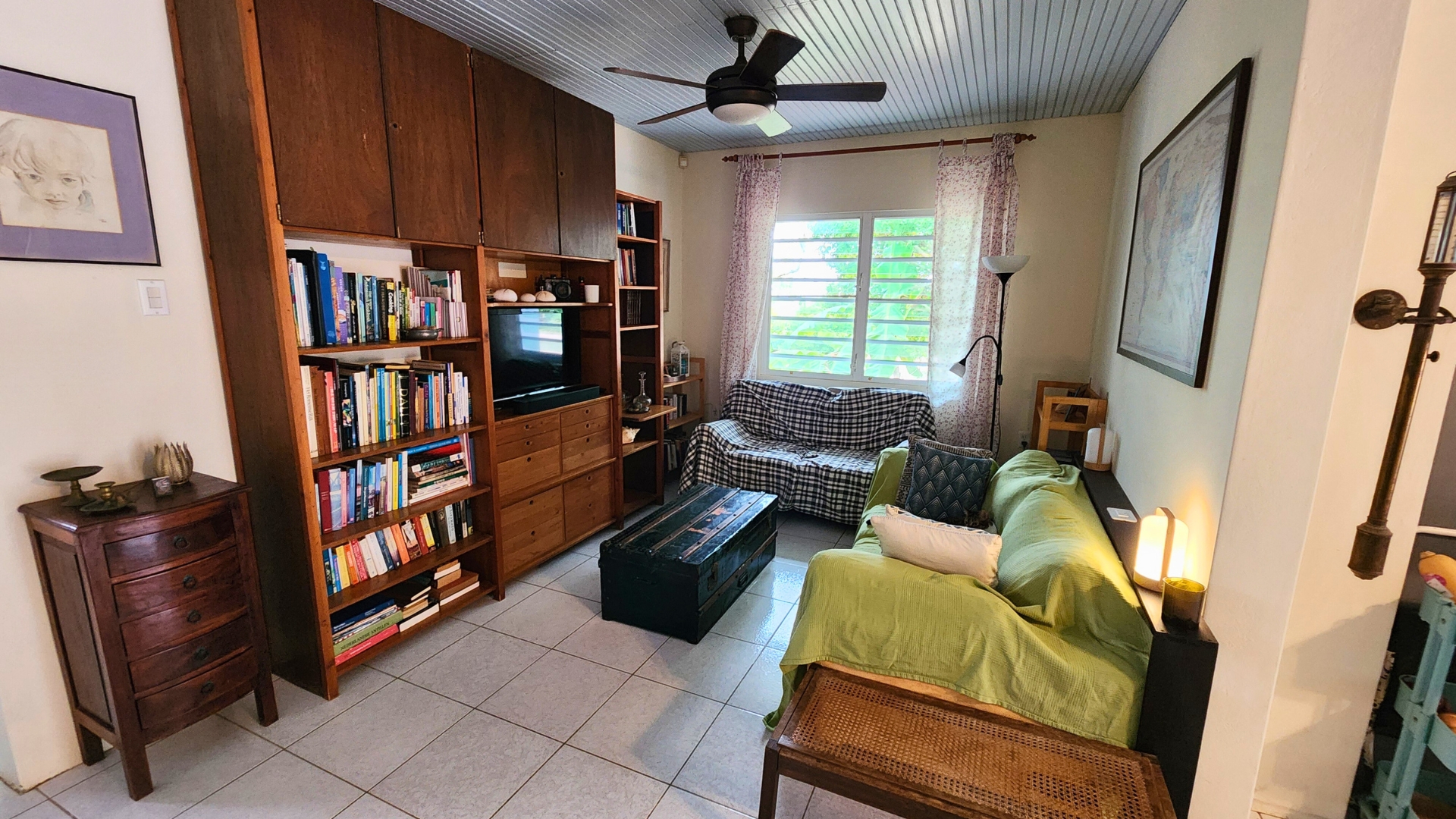 Het hart van dit huis is de warme en uitnodigende woonkamer. Verzamel op koele avonden rond de open haard of open de Franse deuren om de zachte passaatwind binnen te laten.