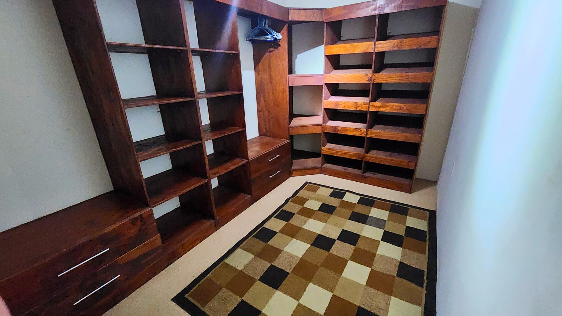 This walk-in wardrobe features custom wooden shelves and drawers. The shelves are divided into different sections, providing ample storage space for folded clothes, shoes or accessories.