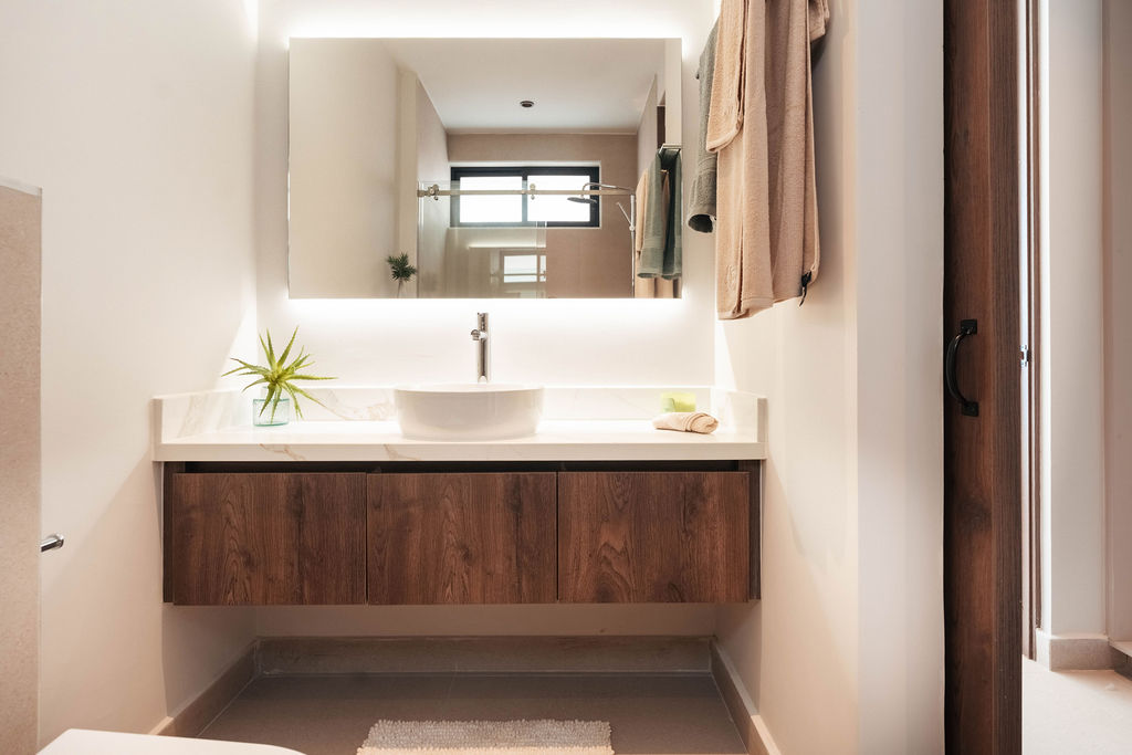Both bathrooms feature elegant finishes, spacious showers, and a spa-like ambiance.