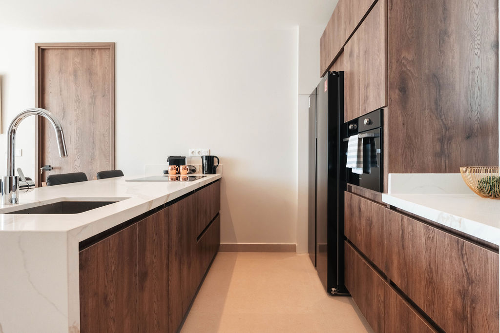Equipped with top-of-the-line appliances, a stylish island with a quartz countertop, and ample storage, this kitchen is perfect for culinary enthusiasts.