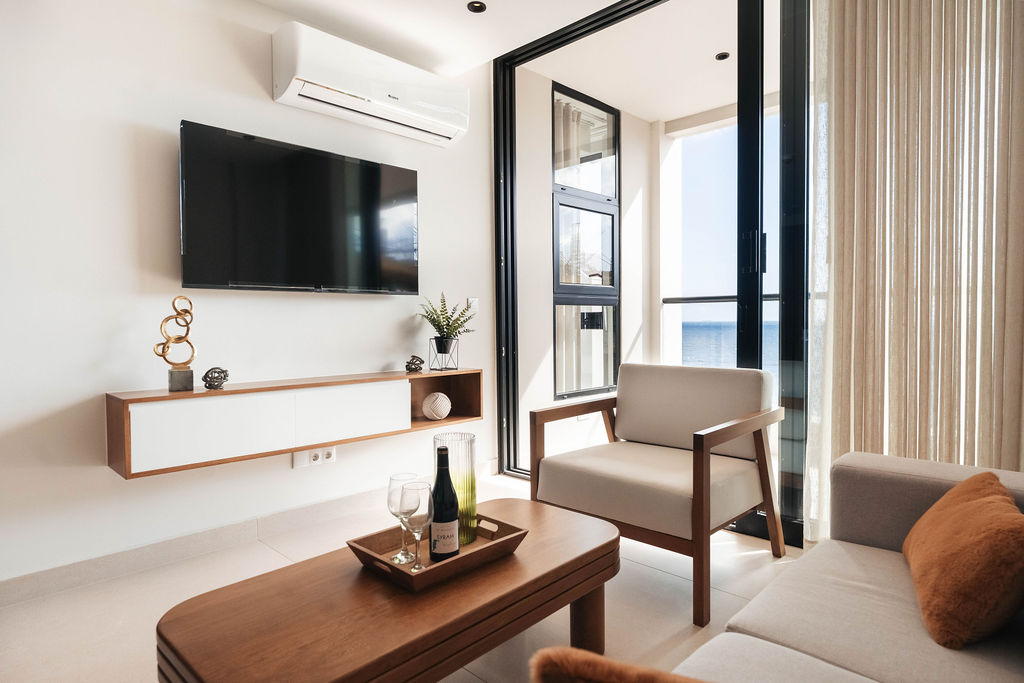 The open-concept living room is bathed in natural light, featuring sleek finishes, tasteful décor, and sliding glass doors leading to a private balcony with ocean views.